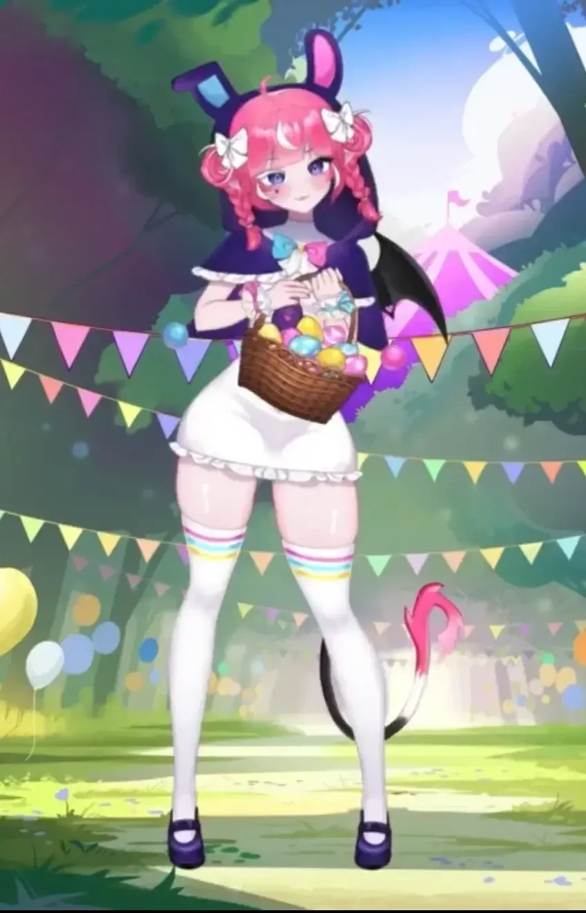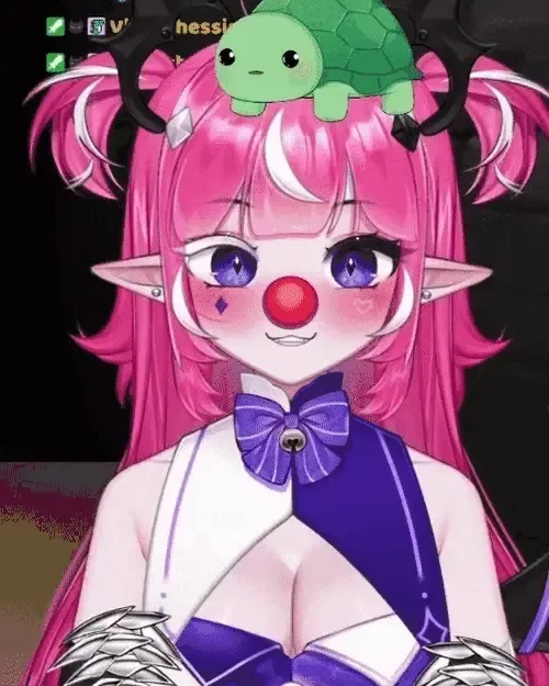 - 发型: 粉色长发,夹杂一缕白色挑染,双马尾造型,佩戴一顶 略显歪斜的派对锥形帽,象征其随时准备庆祝派对的形象设定