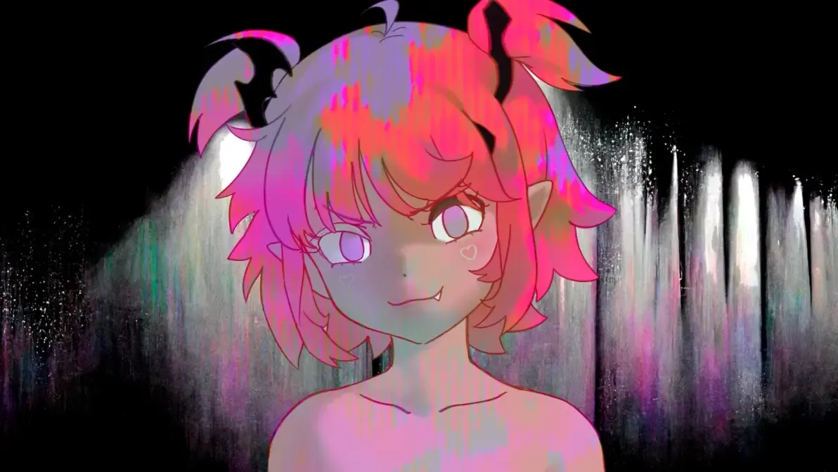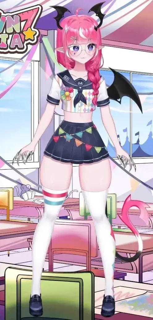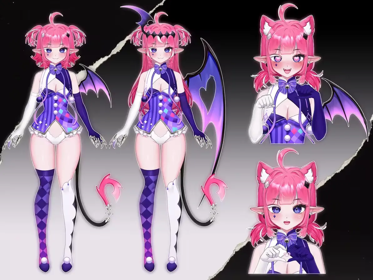 - 头发与犄角:鲜艳的多层粉色发型,梳着齐刘海,头顶两只向外弯曲的黑色蝙蝠翅膀状犄角,更添小精灵般的恶魔气质。